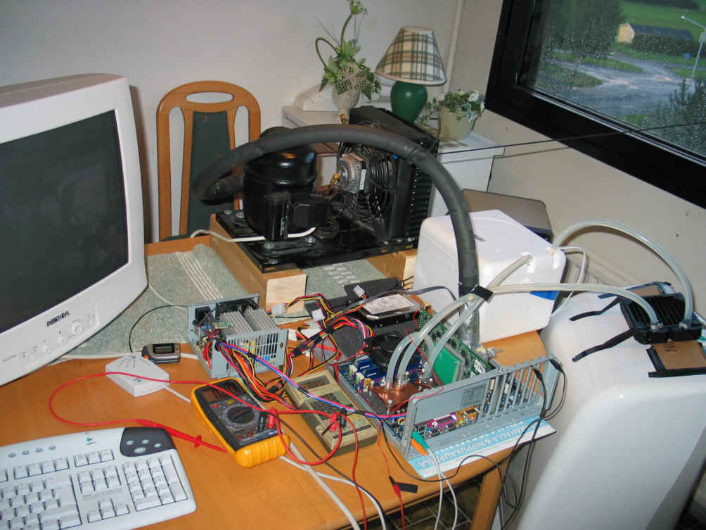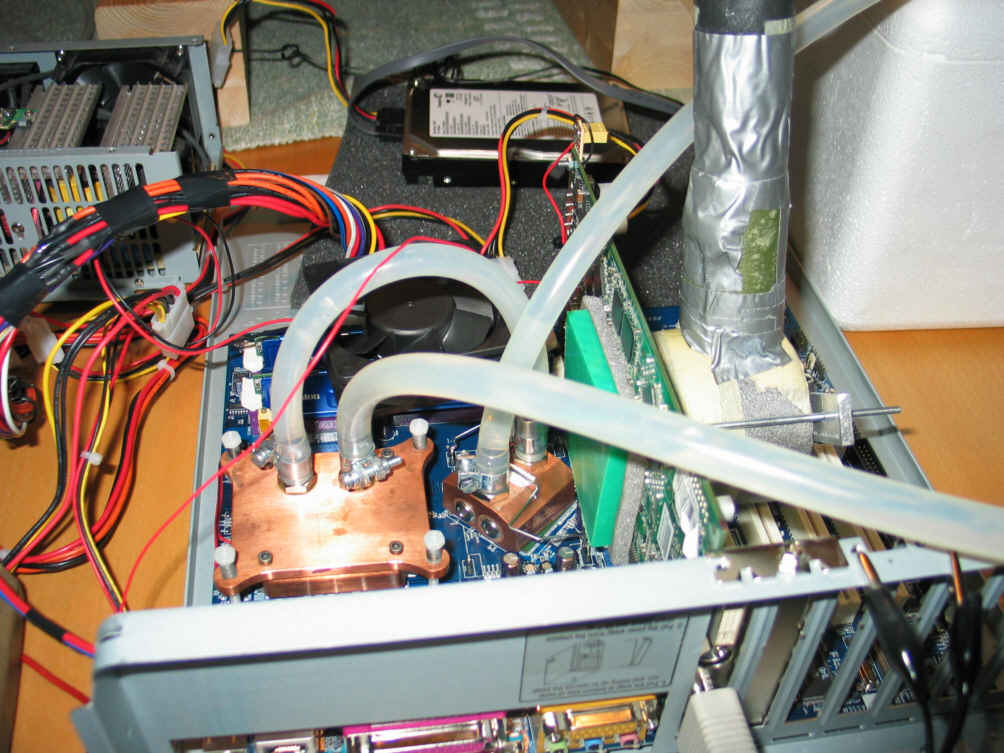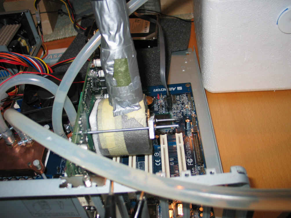 ja blokit alkoivat "hikoilla" todella runsaasti. Ensimmäinen testiajo menikin pieleen koska prosessorin kanta oli veden vallassa ja sen kuivaamiseen meni runsaasti aikaa, tein pientä säätöä ja vedenlämpötilan pysytellessä n. 13 asteessa ei ollut tulvan vaaraa.