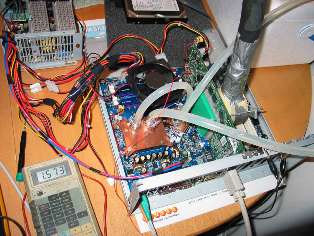 vakaasti n. 3.6GHz asti. Väylätaajuus kun nousee lähemmäs 300MHz niin muisteille pitää syöttää yli 3.3v jännite ja lämmön tuotto on sen mukainen. Veden jäähdytyskennon teippasin kiinni ilmastointilaitteeseen joka osoittautui varsin tehokkaaksi jopa vähän liiankin koska veden lämpö putosi alle 8 asteen