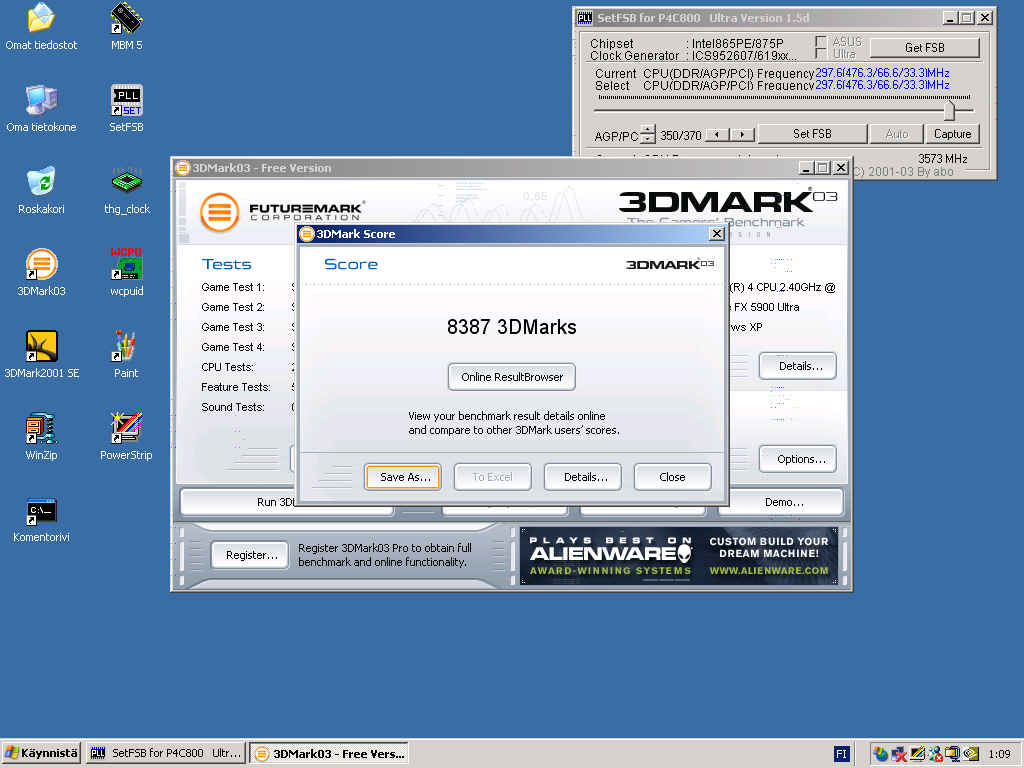 Sain lainaksi Satacom Oy:sta Creative FX 5900 Ultra näytönohjaimen ja kun olin pari viikkoa sittten hankkinut myös R404 kompuran, oli tarvittavat komponentit 3DMarkin ennätys yritykseen.