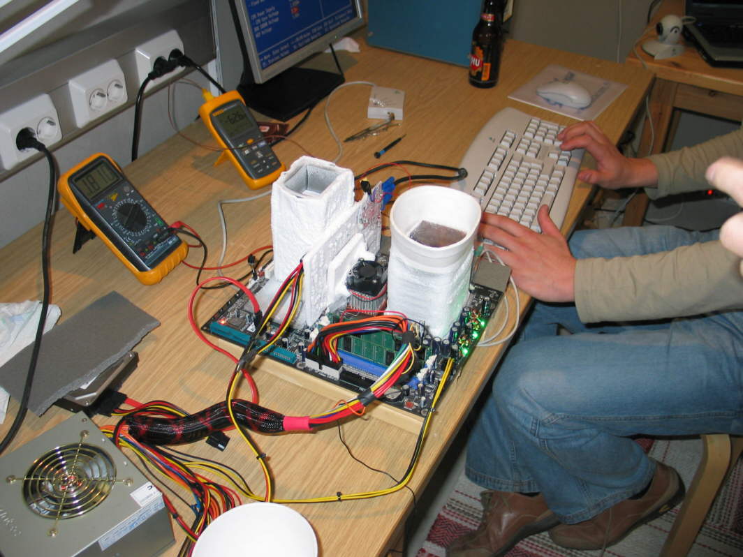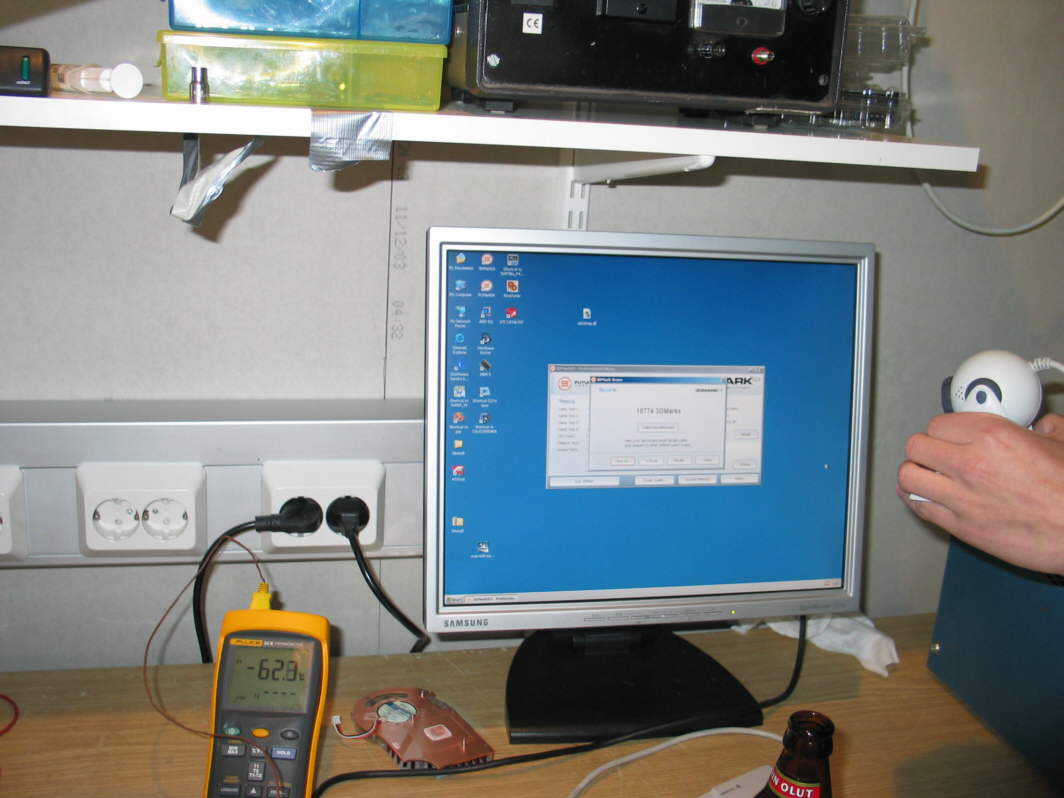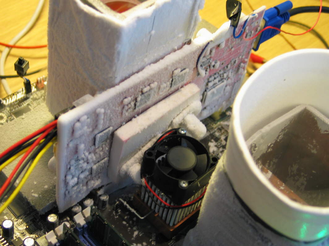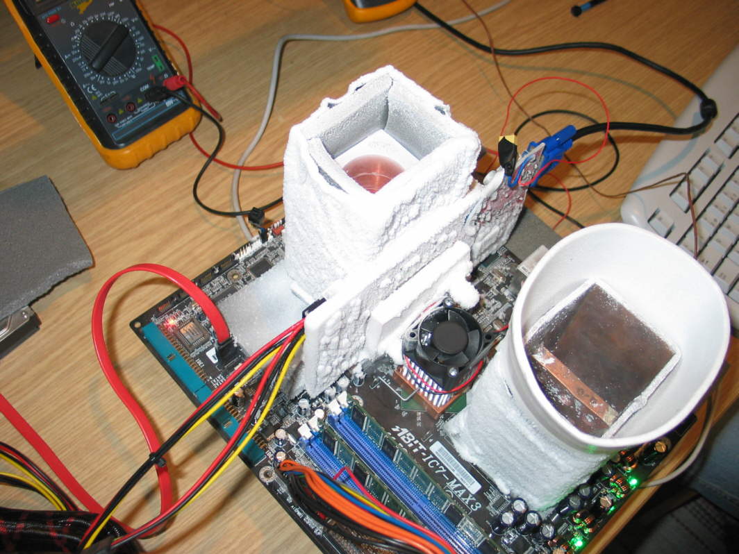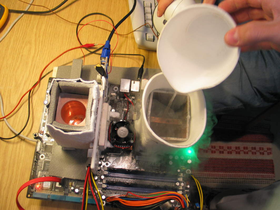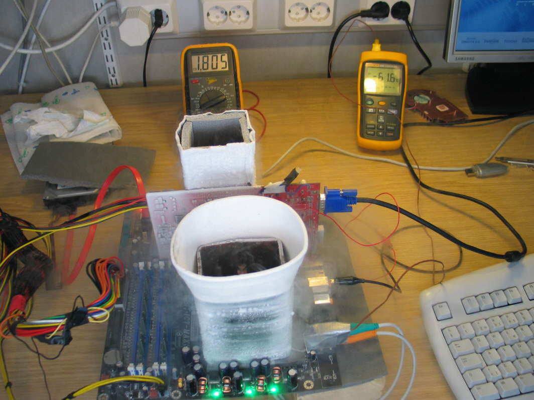se ollut niin tarkka nestetypen annostelusta. Kulhon lämpötila oli testin loppuvaiheessa n. -120 asteen paikkeilla ja prosessori pyrittiin pitämään -60 asteessa, alkuvaiheessa oli paljon ongelmia, kaatuilua, sammumista yms.,