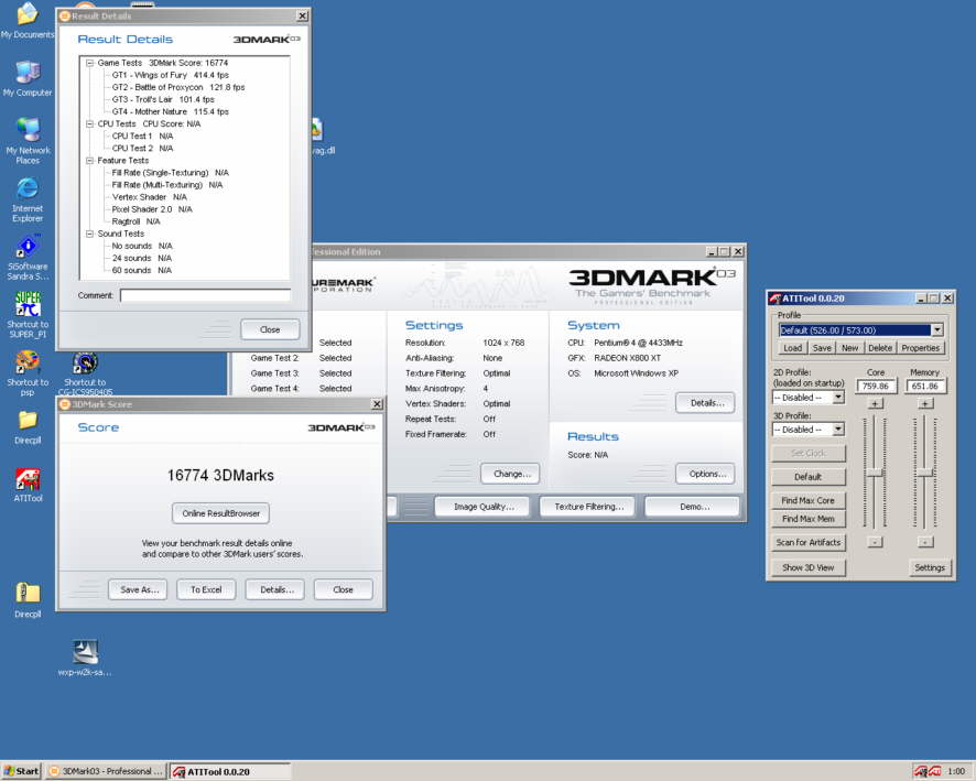sähkönsyötöstä vastasi Antecin 550w poweri. Kellotaajuuksia nostettiin pikkuhiljaa ja parhaassa "vedossa" oli prosessorilla 4433MHz, GPU:lla 760MHz ja muisteilla 652MHz. Lopputulos oli varsin kohtuullinen eli n.6 tunnin "typetyksen" jälkeen